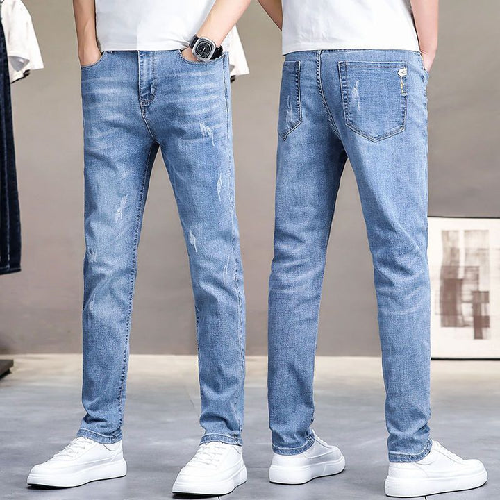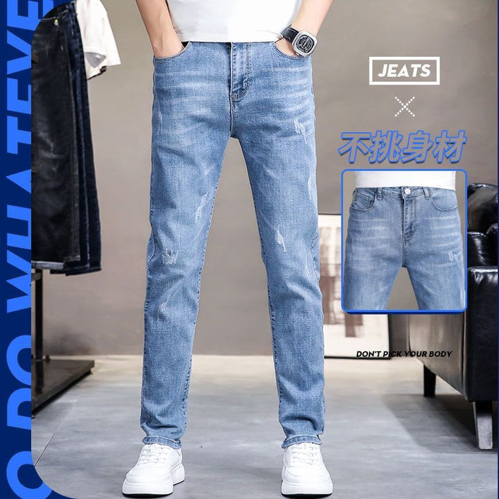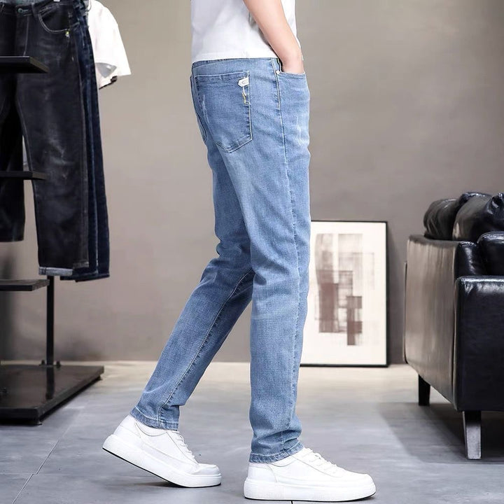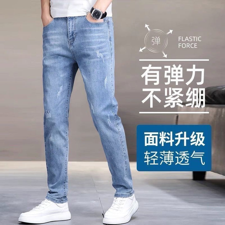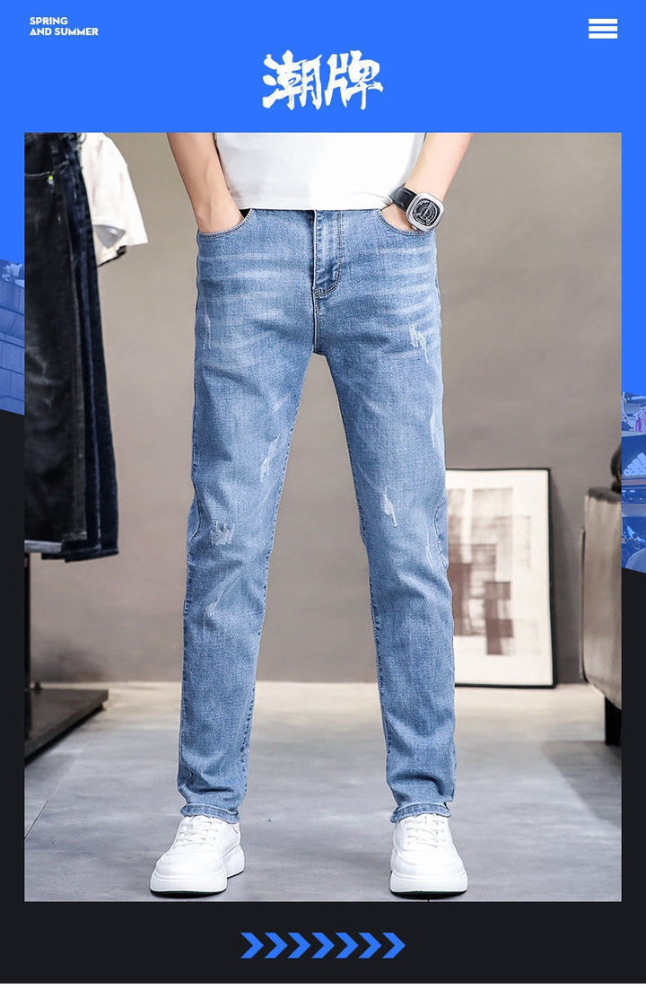 بنطلون جينز رجالي من هونج كونج 2024 جينز مستقيم نحيف بتصميم كوري عالي الجودة مرن بلون فاتح بنطلون كاجوال صيفي رقيق