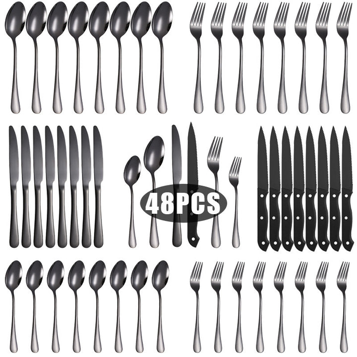 مجموعة أدوات المائدة من الفولاذ المقاوم للصدأ، مجموعة سكين وشوكة وملعقة لـ 8 أشخاص، مجموعة مكونة من 48 قطعة، سكين شريحة لحم ملونة